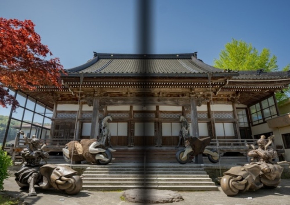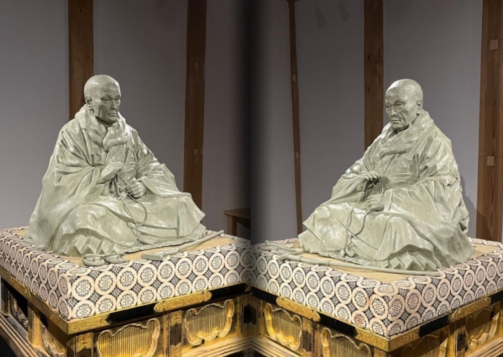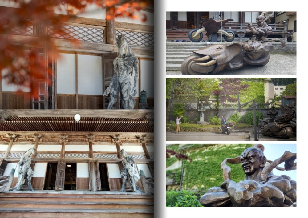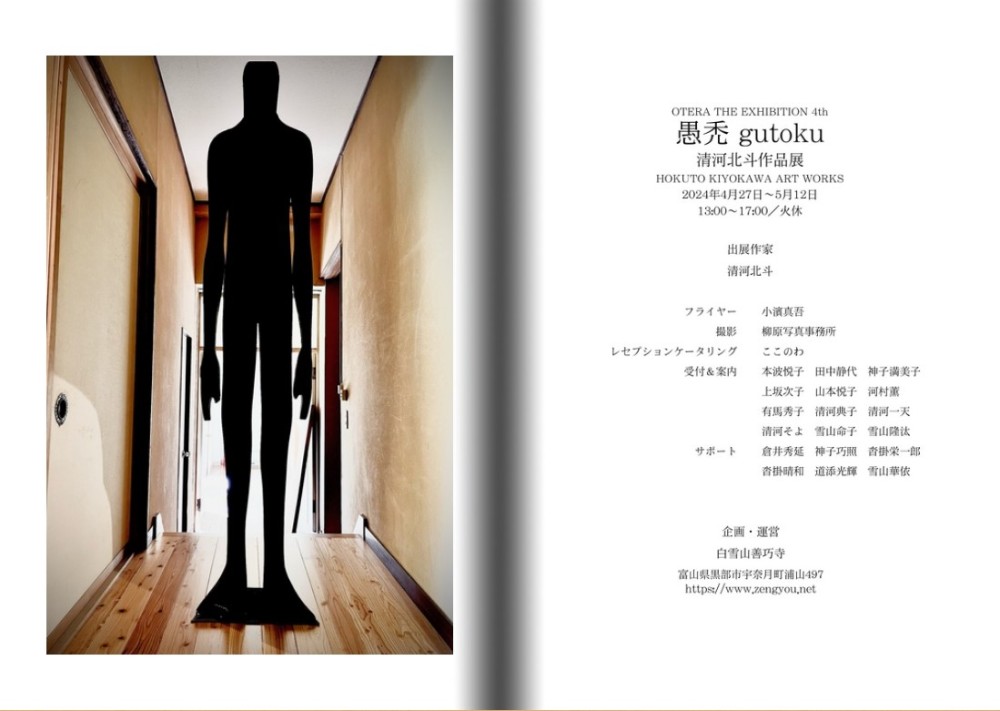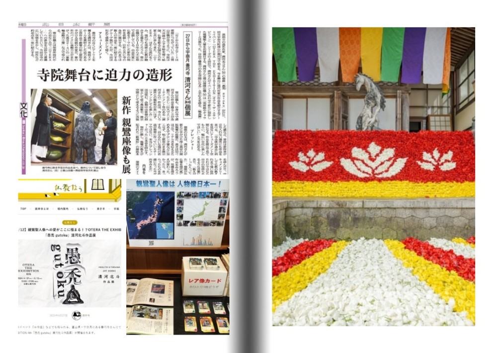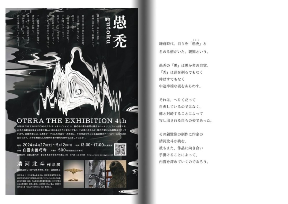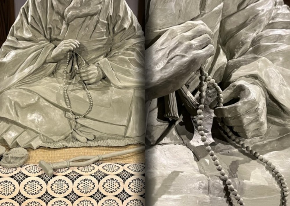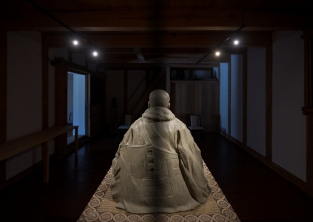 境内には大型作品が立ち並び、本堂の受付から展示会場へ。清河北斗さんの15年分の代表作が客間、裏庭、はなれ、お蔵に展示されました。今回の依頼作「愚禿-親鸞聖人像-」は1番奥のお蔵に安置し、空気が一変する空間で親鸞聖人とご対面。多くの感嘆の声が聞かれました。その一端をご覧ください。