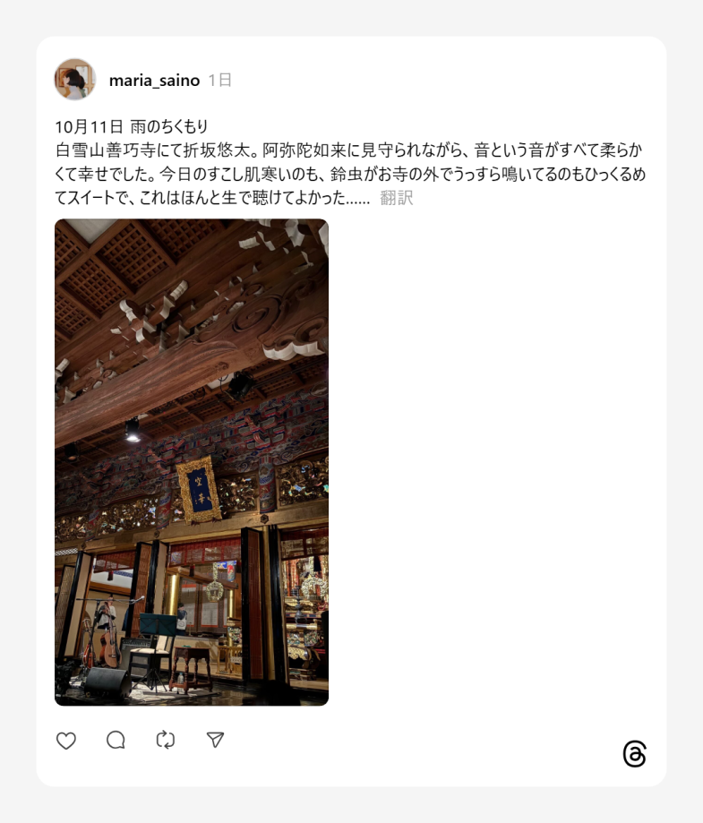 今回のライブは、これまでの自主企画「お寺座ライブ」とは異なり、ライブ運営会社(カウアンドマウス)からお声がけをいただき実現したものです。以前より交流があったことに加え、折坂悠太さんへは過去にこちらからもライブを依頼した経緯があり、さまざまなご縁が重なっての開催となりました。
