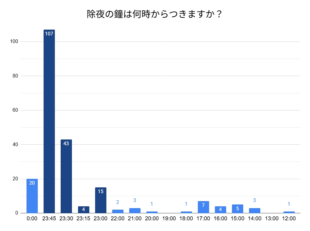 集計結果からは、除夜の鐘の開始時刻が23時台に明確に集中しており、特に23:45が突出しています。