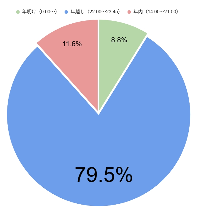 これらを合計すると、23時台開始が全体の約8割を占めています。開始時刻は分単位ではばらつきがあるものの、いずれも年越しの瞬間を含む時間帯として選択されている点に共通性が見られます。