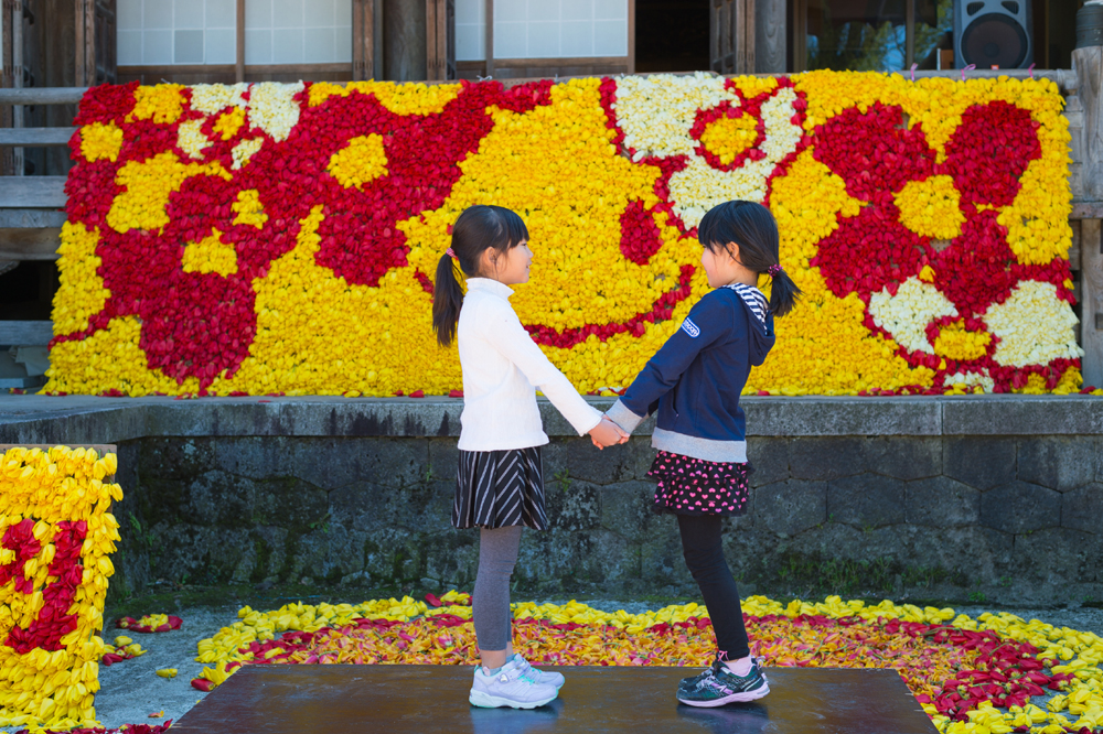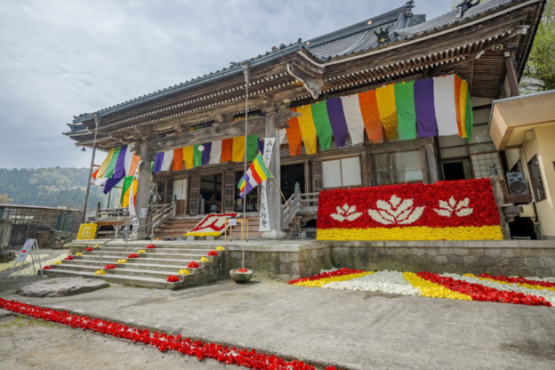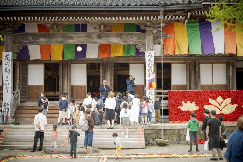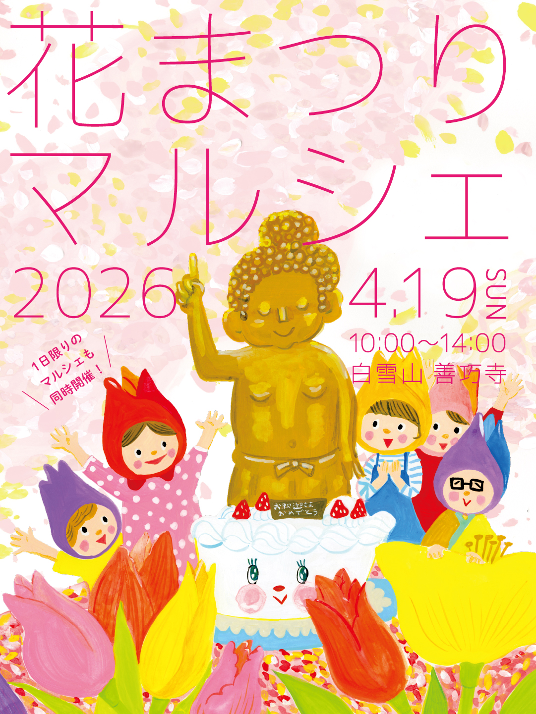 お釈迦さまの誕生をご縁に、どなたでも自由に楽しめる一日です。春の花に囲まれながら、美味しいもの、素敵な雑貨など、様々な出店者がお待ちしています。本堂ではおごそかな儀礼が行われ、しめくくりは、チューリップシャワーで爽快に幕を閉じます。