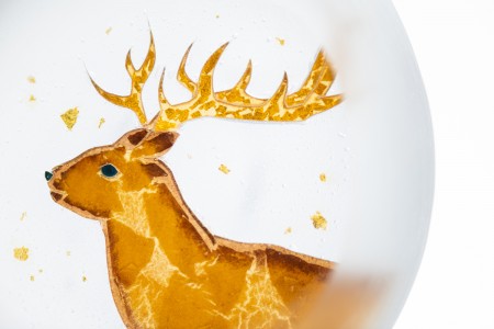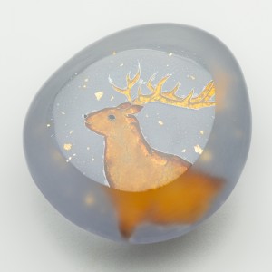 お釈迦さまの前世の物語「ジャータカ」に収めらた物語です。このお話を元に色絵磁器作家の梅田かん子さんは作品を制作されました。このお話を選んだ理由はエンディングにあるそうです。通常の物語では勧善懲悪やハッピーエンドのオチをつけて終わりますが、ここでは、プツっと途切れるように物語は終わり、しかも一見お釈迦さまのウズラはとても冷たい印象を与えます。でも、梅田さんはそこにお釈迦さまの深い愛情を汲み取っておられました。